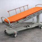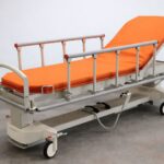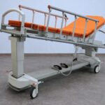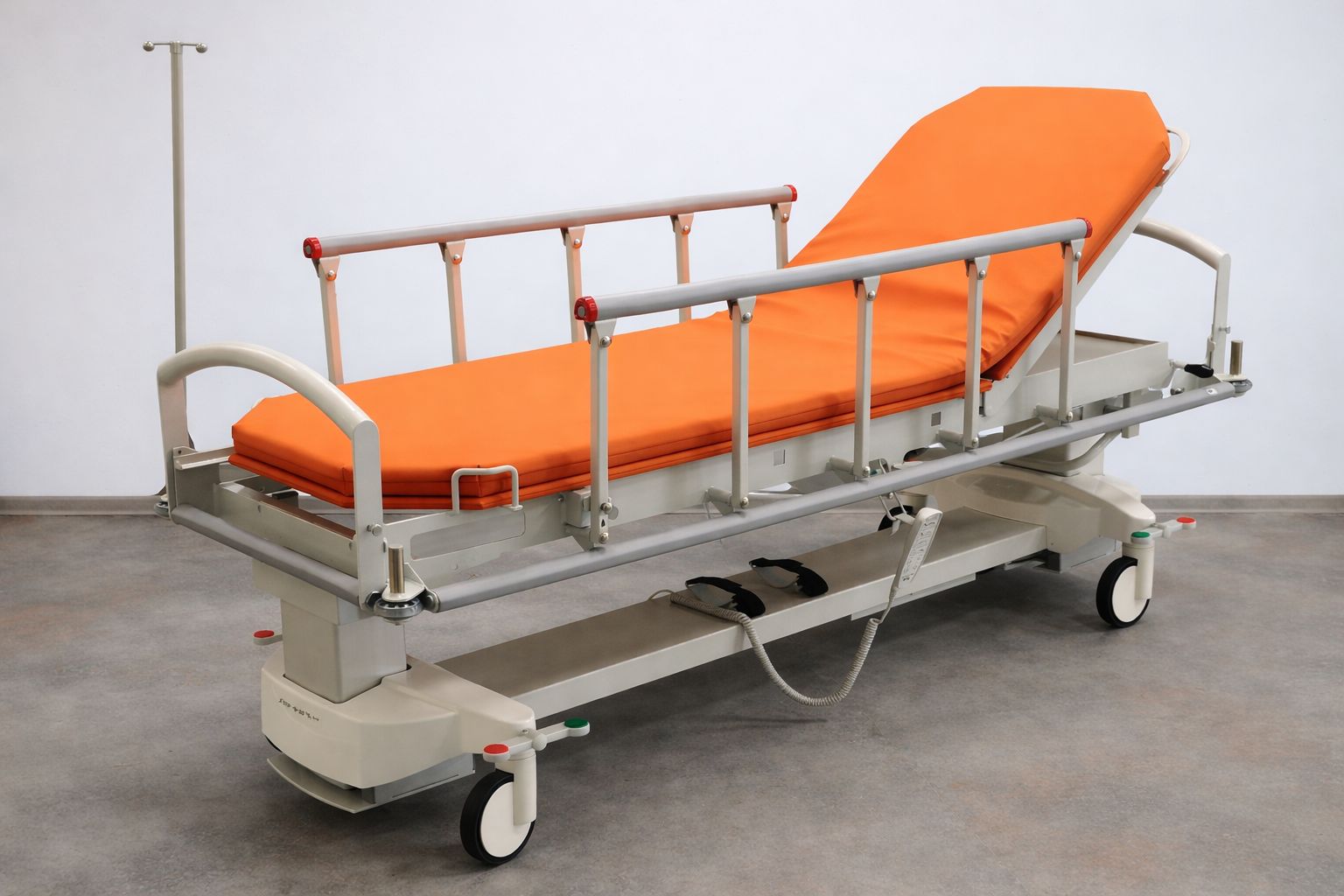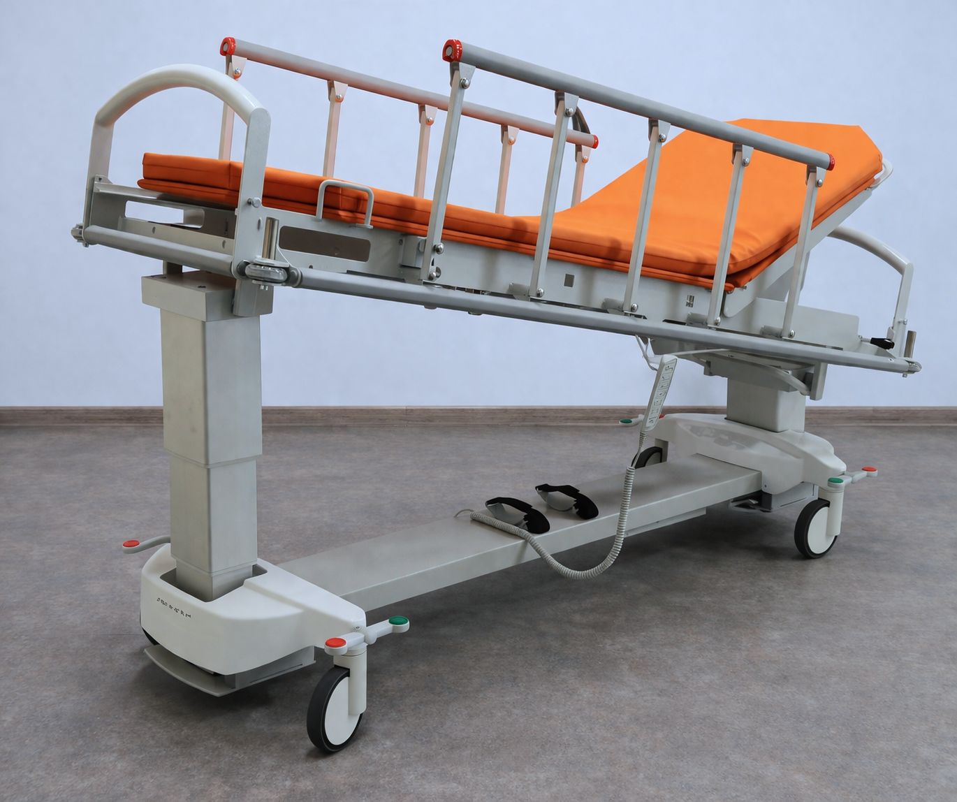 Standardní výbava: bezpečnostní protinárazový profil po obvodu konstrukce, protinárazová kolečka v rozích, sklopné zábrany proti pádu pacienta, sklopná madla pro obsluhu v čelech, snímatelný infuzní stojan, držák na kyslíkovou láhev, upínací popruh pacienta.